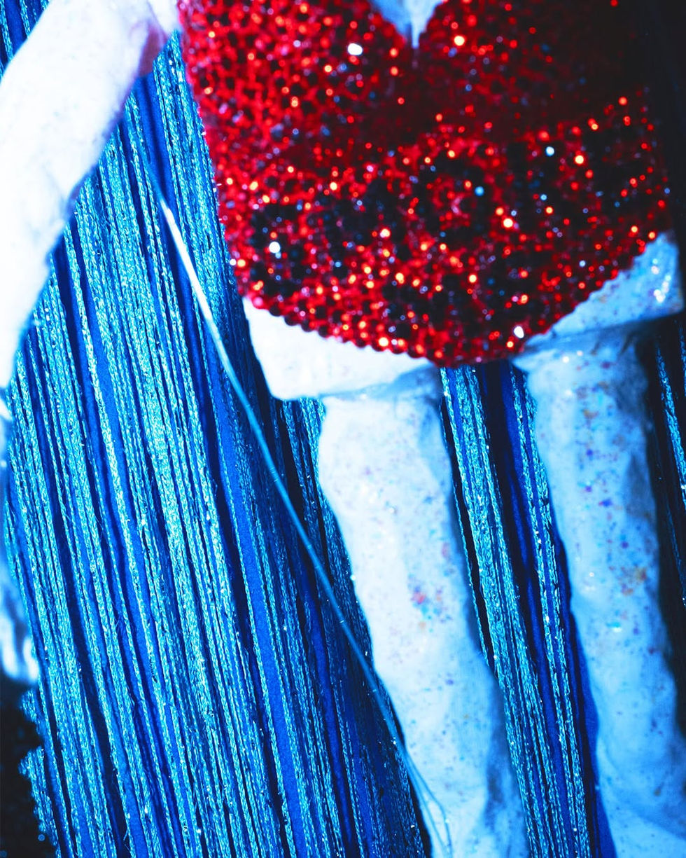 Materials: Paper mache, fabric, paint, monofilament, rhinestones, feathers.